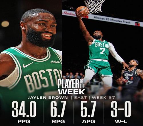 12月9日,NBA官方公布了上周东西部最佳球员人选。凯尔特人队的杰伦-布朗和丹佛掘金队球员贾马尔-穆雷分别当选。